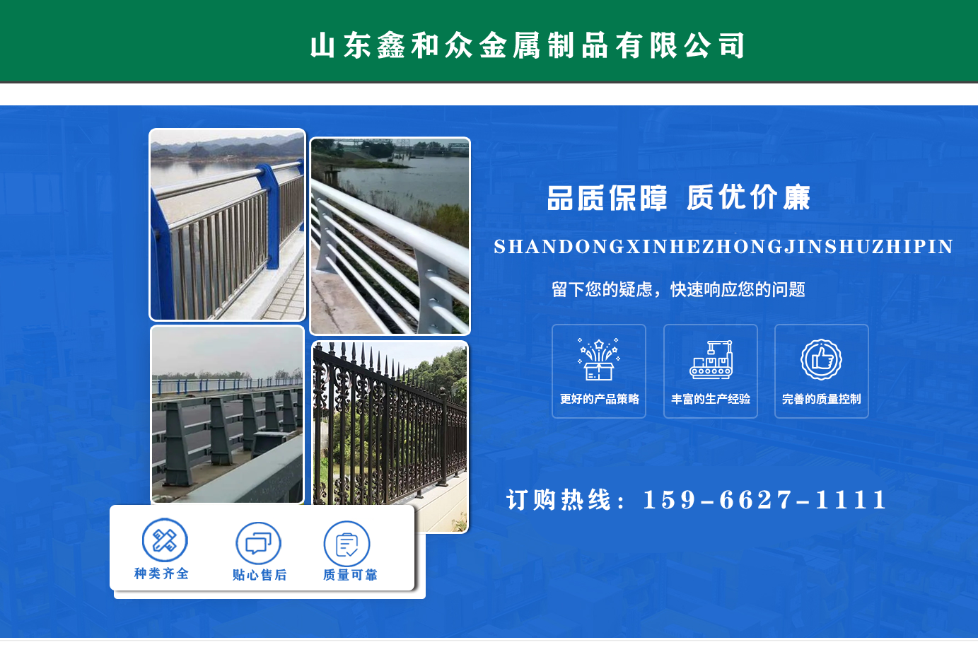 山東鑫和眾金屬制品有限公司主要產(chǎn)品有防撞護(hù)欄,橋梁護(hù)欄,道路護(hù)欄,河道護(hù)欄,不銹鋼護(hù)欄等護(hù)欄。提供設(shè)計(jì)方案,一站式定制,包您滿意價(jià)格優(yōu)惠,歡迎來(lái)電咨詢! 公司常年從事銷(xiāo)售護(hù)欄防撞護(hù)欄,橋梁護(hù)欄,道路護(hù)欄,河道護(hù)欄,不銹鋼護(hù)欄,橋梁鋼護(hù)欄,河道燈光護(hù)欄等。產(chǎn)品廣泛應(yīng)用于橋梁、河道、旅游景區(qū)、道路、公路、公園、小區(qū)、景觀、道路防撞等領(lǐng)域。 公司產(chǎn)品均采用優(yōu)質(zhì)不銹鋼材料,符合相關(guān)標(biāo)準(zhǔn)。各種型號(hào)不銹鋼復(fù)合管及護(hù)欄,質(zhì)量嚴(yán)格把控。產(chǎn)品強(qiáng)度高、耐腐蝕、焊接牢固、抗沖擊、性能好,防撞護(hù)欄結(jié)構(gòu)簡(jiǎn)單、美觀實(shí)用大方?! g迎前來(lái)訂購(gòu)!...
